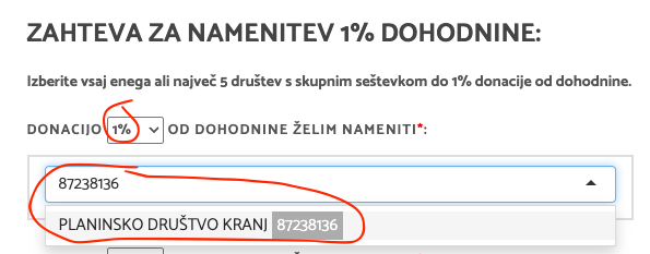 • najlažje: preko računalnika ali pametnega telefona izpolnite spletni obrazec: https://www.olympic.si/podarim – kopirajte davčno številko: 87238136, jo vnesite / prilepite v polje: “Donacijo 1% od dohodnine želim nameniti:” in izberite “PLANINSKO DRUŠTVO KRANJ 87238136
